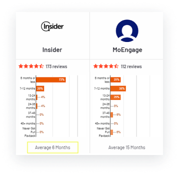 We've ranked as the #1 platform in Mobile Marketing Software and Personalization Software and topped the charts on the Results Index, Relationship Index, Usability Index and Implementation Index on G2’s Summer’21 Report. Based on 100% user reviews, we've achieved an average user satisfaction score of 4.6/5 on G2 where 81% of users rated Insider 5 star.