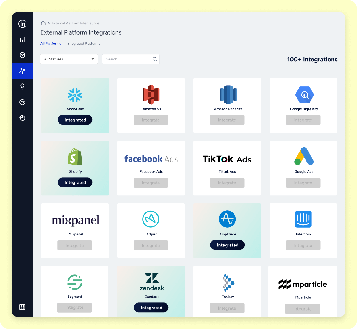 Sync customer, engagement, and product data across your entire tech stack with 100+ out-of-the-box integrations in 20+ categories, including CRM, analytics, paid ads, social media, and more.