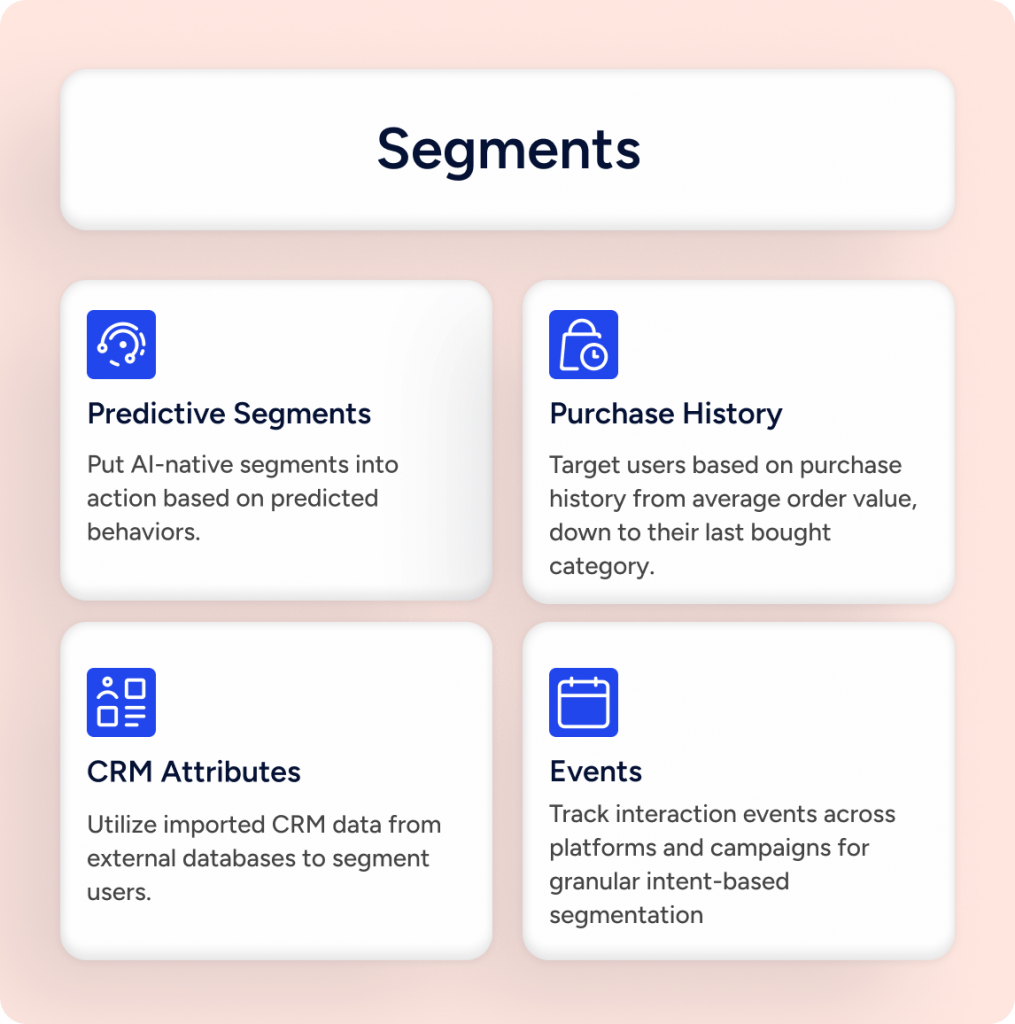 Identify, define, and target your audience with 120+ out-of-the-box filters and triggers, including traits, behaviors, preferences, and more. Create custom filters and triggers to suit your business needs and reach customers at the right time, on the right channel, with the right message—no IT support required.