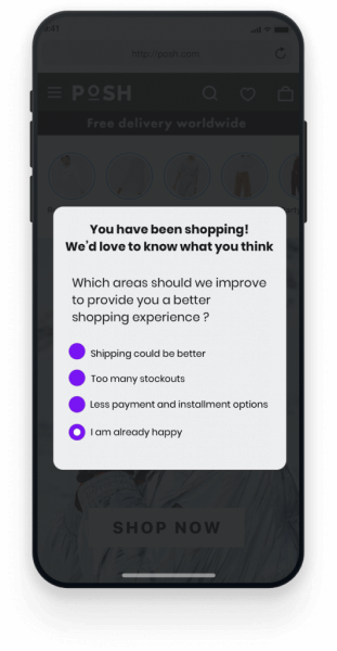 You can collect detailed feedback on your user’s shopping experience with enticing and engaging questionnaires and NPS style surveys. Moreover, make giving feedback fun and easy with an emoji styled feedback scaler, which registers live customer feedback and results in higher response rates. This helps you to detect bugs speedily, so that you can fix user experience issues before they cause a big dent in your user numbers. Doing this regularly will get you as close to the perfect app as possible and minimize your app uninstalls.