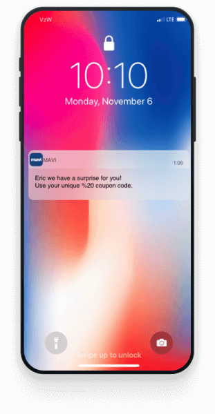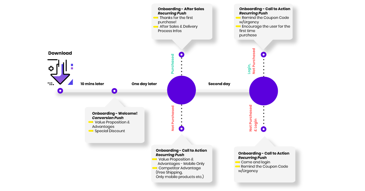 For an eCommerce app, build a full-funnel cycle which covers the first 30 days, enticing your users with incentives like coupon codes or free shipping with recurring push notifications. However, make sure that users who purchase an item from the app are then excluded from the onboarding funnel and are instead sent instead down the post-purchase funnel.