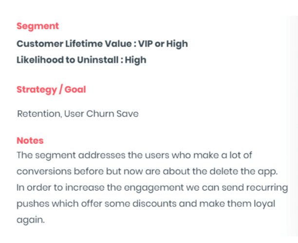 An AI-based segmentation tool can cluster your users into automated segments like your VIPs or customers who are at risk of uninstalling the app. With these valuable and actionable insights, app marketers can take action to prevent customers from uninstalling the app before it is too late by providing incentives to stay.