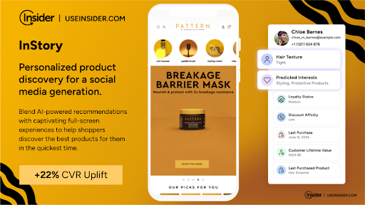 Product Discovery for the Mobile GenerationOne of the main focuses of our discussion was the growing need for retailers to address and improve the search and product discovery experience for mobile. The traditional ecommerce search experience is simply not built to drive results from mobile devices. PATTERN’s approach to solving this is supported by Insider One’s InStory solution, which offers personalized product discovery for the social media generation. Driven by AI-powered recommendations, it combines deep Predictive AI with captivating fullscreen experiences to help mobile users discover the best products for them in the quickest time, in a familiar full-screen, social-media inspired experience. InStory allows users to click on thumbnails that expand into full-screen, immersive stories, highlighting products in a visually appealing format.