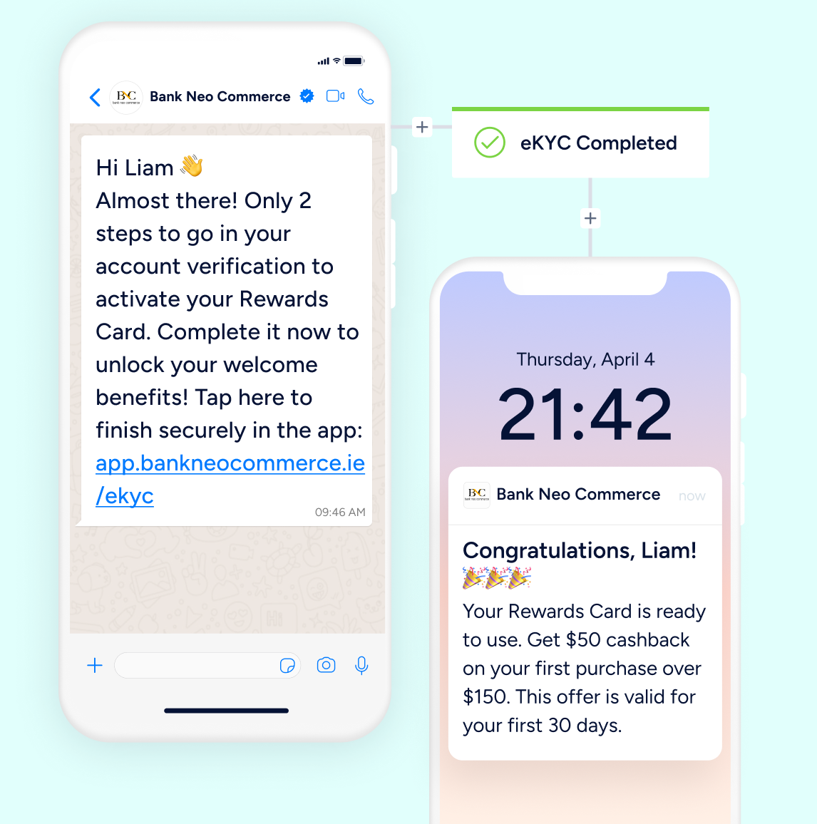 Recover users who abandon during eKYC with timely WhatsApp and app push nudges. Then guide them toward their first transaction to complete onboarding.