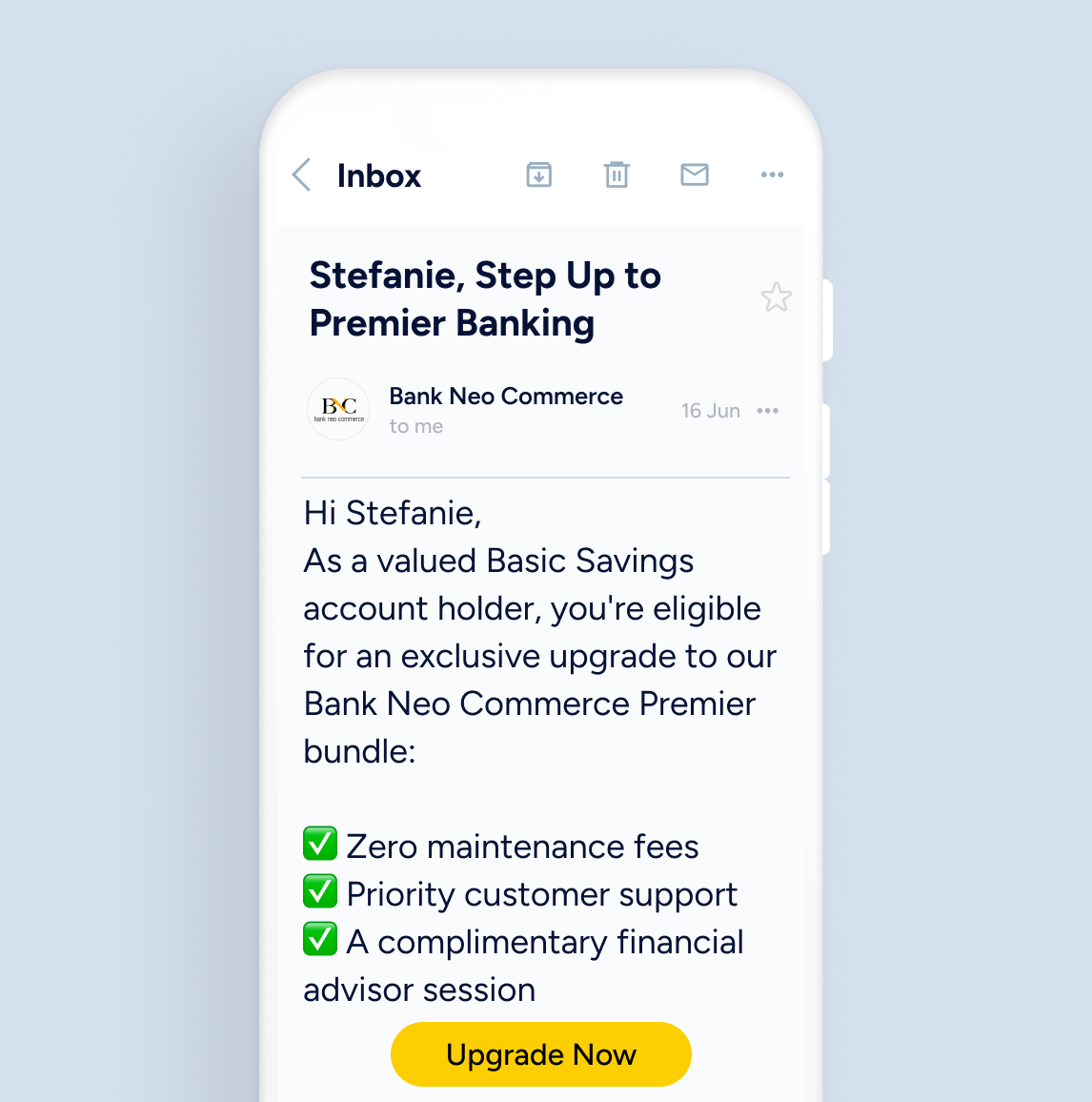 Win back disengaged customers through email campaigns offering bundled upgrades with real value. Give priority support, fee waivers, and loyalty rewards that spark action.
