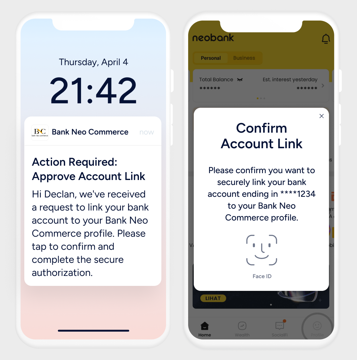 Trigger push notifications and require biometric or PIN confirmation for sensitive onboarding actions. Personalize flows by role and risk, ensuring security without disrupting the customer experience.