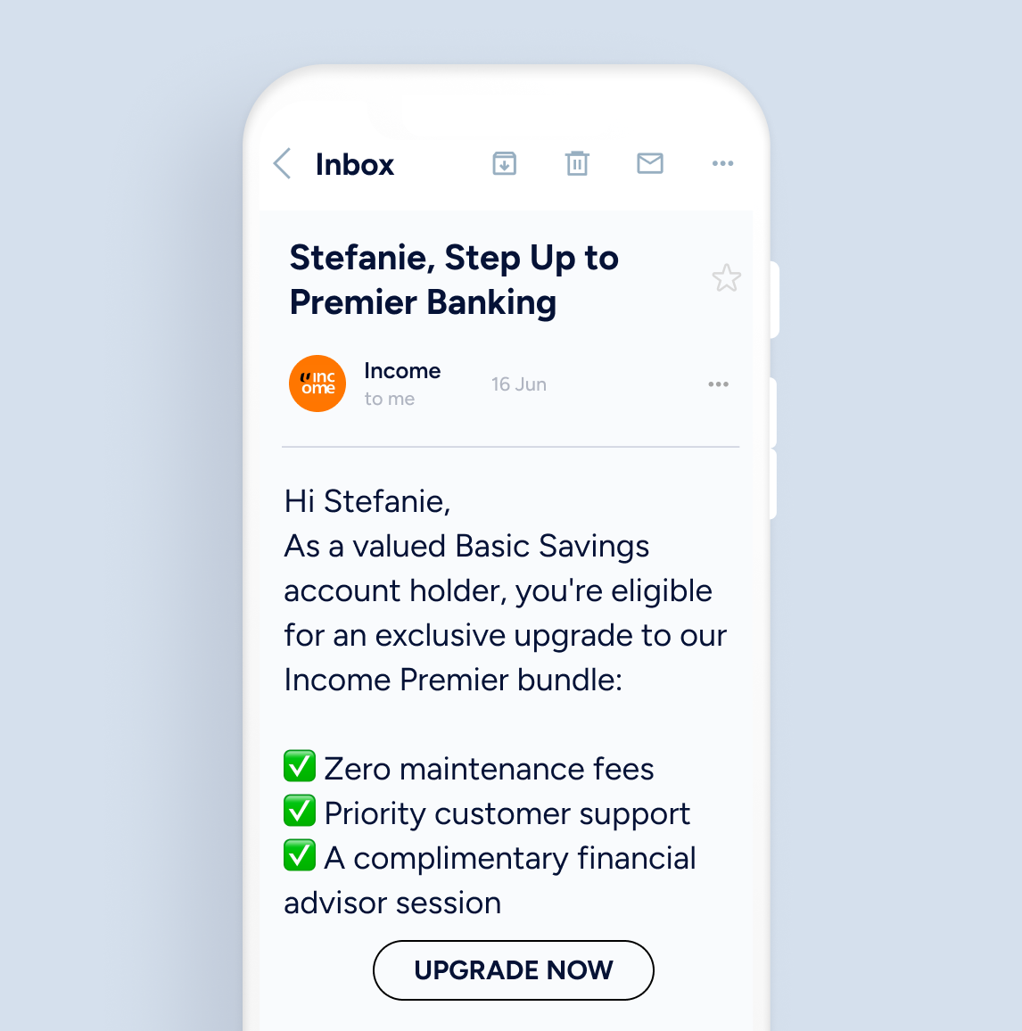 Win back disengaged customers through email campaigns offering bundled upgrades with real value. Give priority support, fee waivers, and loyalty rewards that spark action.
