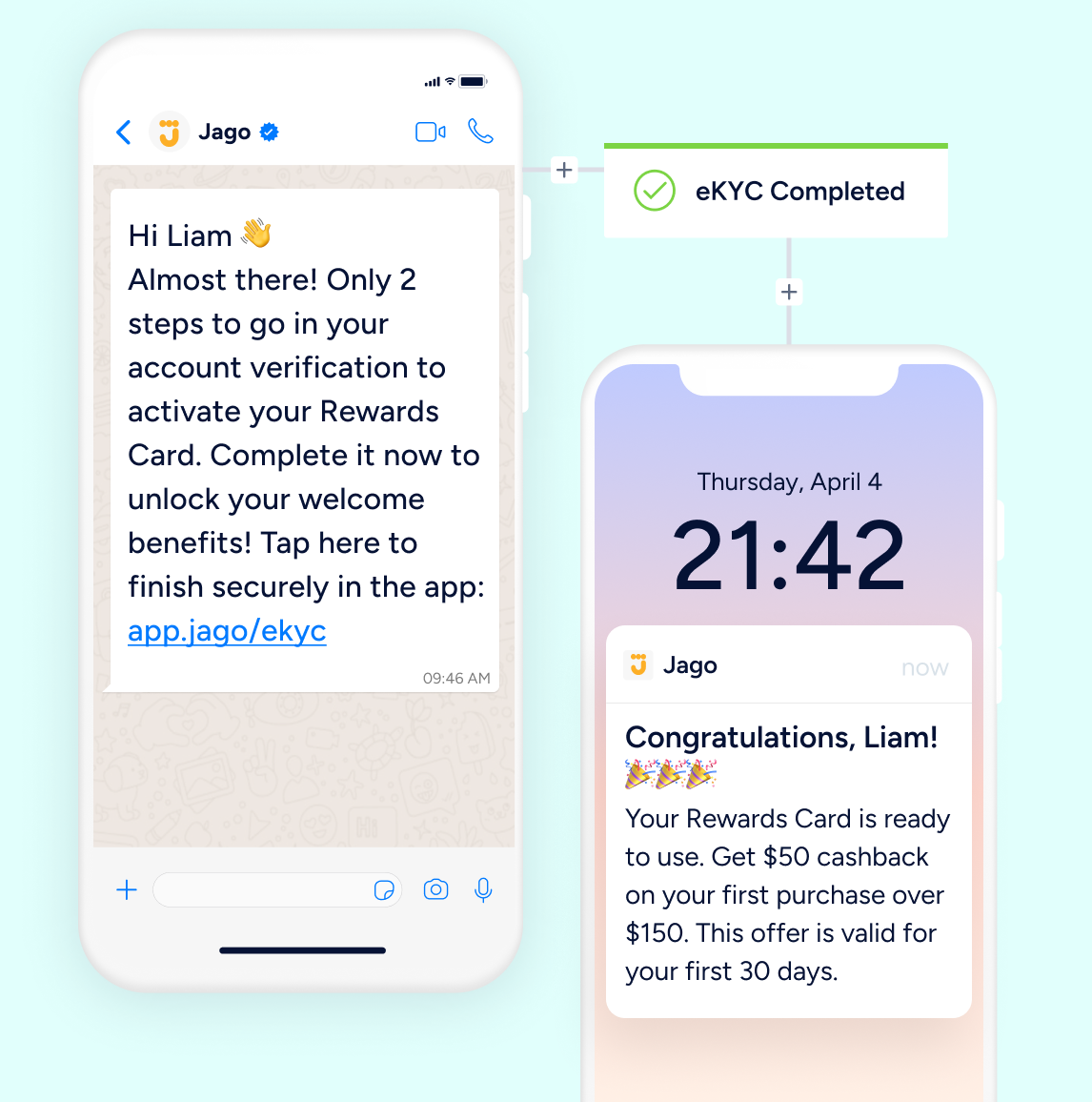 Recover users who abandon during eKYC with timely WhatsApp and app push nudges. Then guide them toward their first transaction to complete onboarding.