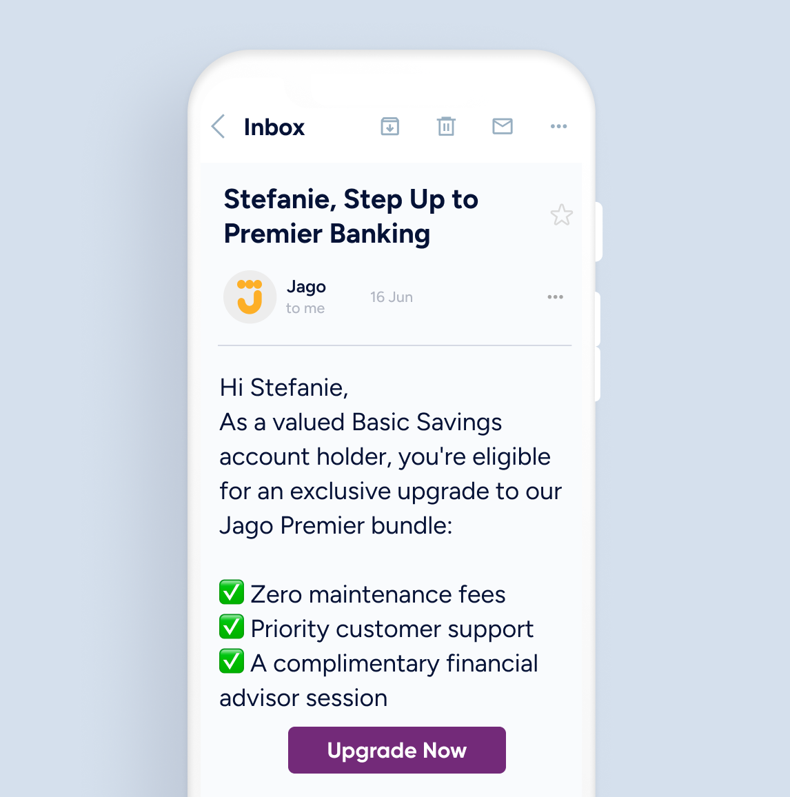 Win back disengaged customers through email campaigns offering bundled upgrades with real value. Give priority support, fee waivers, and loyalty rewards that spark action.