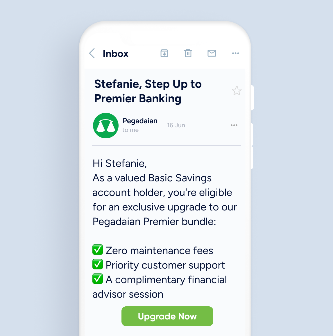 Win back disengaged customers through email campaigns offering bundled upgrades with real value. Give priority support, fee waivers, and loyalty rewards that spark action.