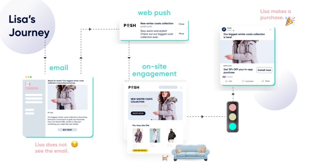 Three hours later, Lisa receives an email from Posh.com providing details of the upcoming launch of the new winter coats collection. 📩 But, Lisa does not see the email.
