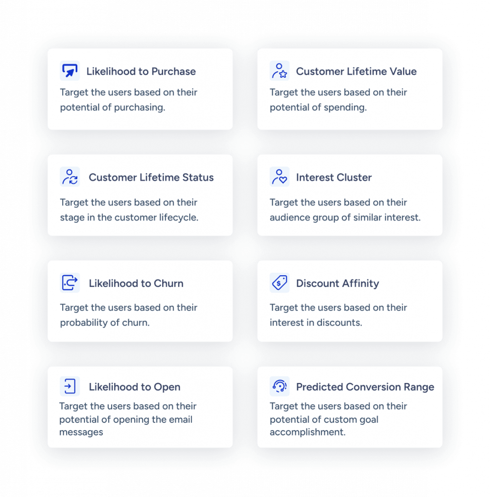 - Predictive characteristics, such as likelihood to purchase, likelihood to engage on a specific channel (like email and SMS), or discount affinity.