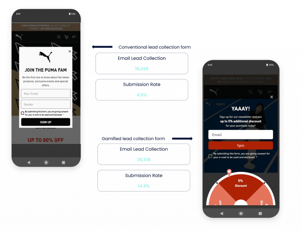 Puma is a great example of a B2C company that used gamification to drastically speed up its lead generation efforts. Our team recommended they implement a “Spin-the-Wheel” overlay for an interactive experience where users would win a discount coupon by submitting their emails.