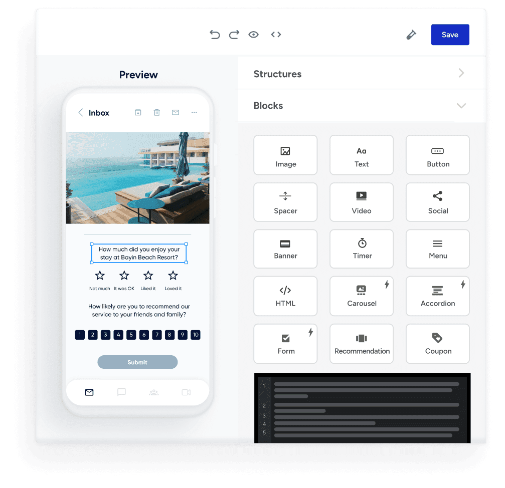 - Easy drag-and-drop editor: You can build beautiful, engaging, and personalized emails by dragging and dropping elements like customers’ names, cart items, buttons, images, and much more. You also have the freedom to preview your emails on all devices and add custom code for maximum flexibility.