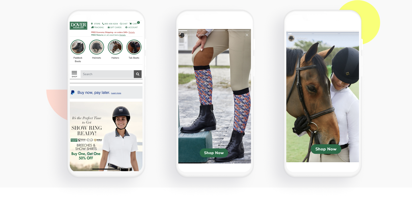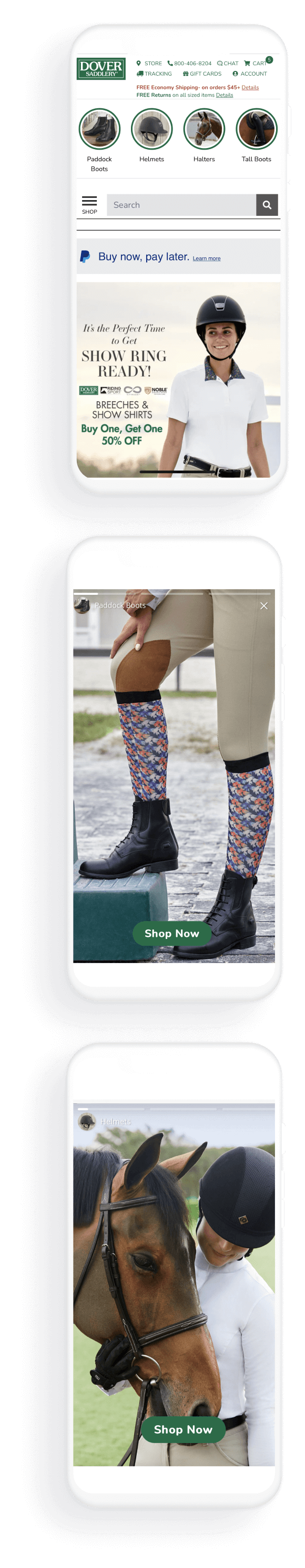 To improve product discovery and engagement rates, Dover Saddlery implemented InStory—Instagram-style stories that speed up product discovery and increase engagement with full-screen, immersive stories. This simple to use tool helped the team save resources by enabling them to repurpose Instagram content for InStory, rather than wait for lengthy design cycles from their internal design team.