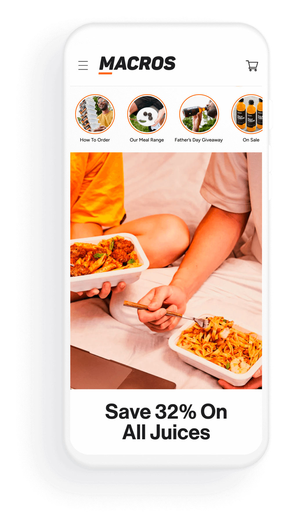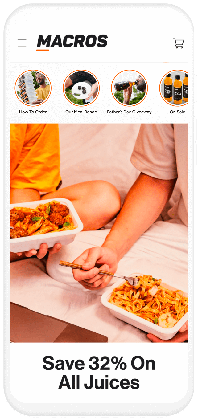 Insider’s InStory solution is a product discovery tool that emulates the familiar social media ‘story’ format to engage the 8-second attention span. MACROS used InStory to launch new products, boost product discovery, and answer FAQS. The brand covered topics including ‘How To Order,’ ‘Our Meal Range,’ and an event-based story titled ‘Father’s Day Giveaway.’ As InStory is such a familiar format, the brand saw immediate results in both revenue and impressions.