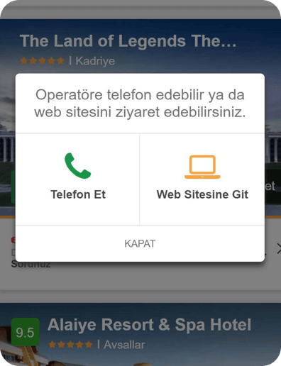 Neredekal.com designed a personalized overlay message shown on hotel listing and detail pages. Two call to action buttons (CTAs) were presented on the overlay, directing users to a hotel booking page and giving them the option to place a call. However, having two options on the overlay resulted in the phone call option bringing 10 to 12 times more revenue compared to the redirects to hotel booking pages. Neredekal.com wanted to test whether removing the overlay message would drive more conversions and revenue.
