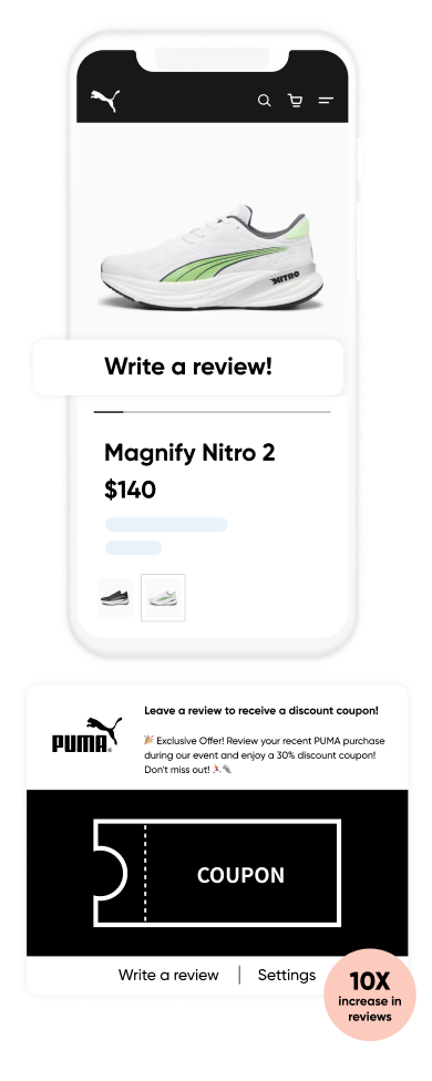 PUMA was looking to generate more high-quality customer reviews on its newly re-launched website to encourage more customers to make a purchase and increase sales competitiveness. As reviews are user-generated, a strategic approach was needed to motivate users, prompting them to write a review at the opportune moment and direct them towards an appropriate reward.