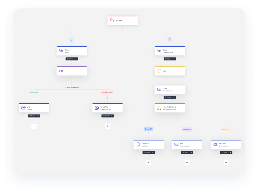 Khả năg xây dựng hành trình người dùng đa kênh, đa điểm chạm từ các kịch bản đơn giản đến phức tạp cùng các tính năng nâng cao với sự hỗ trợ của AI/ML như chọn nhánh hành trình tốt nhất, chọ kênh tương tác tối ưu nhất hay thời gian gửi tối ưu.