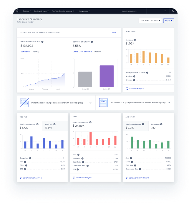 Kết nối, dự đoán, cá nhân hoá và phát triển trên quy mô lớn bằng cách sử dụng dữ liệu và các công cụ bàn đã tin dùng. Từ các nền tảng phân tích nâng cao đến CRMs, giải pháp email marketing và hơn thế, Insider có khả năng tích hợp với tất cả.