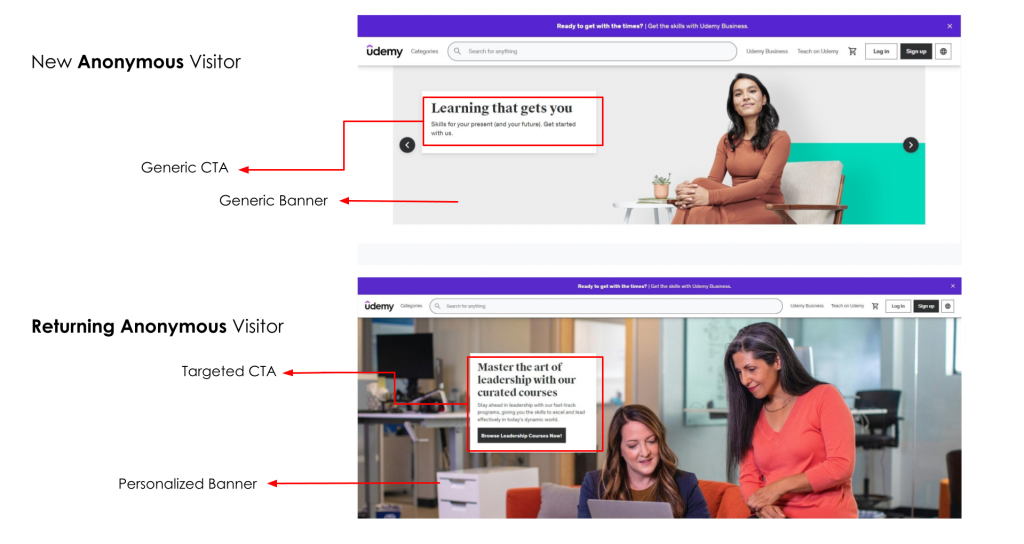 With Insider, you can track anonymous prospective visitors (without PII) who have shown an interest in a specific course, such as leadership in this example, target them through our AI-powered segmentation, and deliver a fully personalized experience on their subsequent visit based on their course of interest.