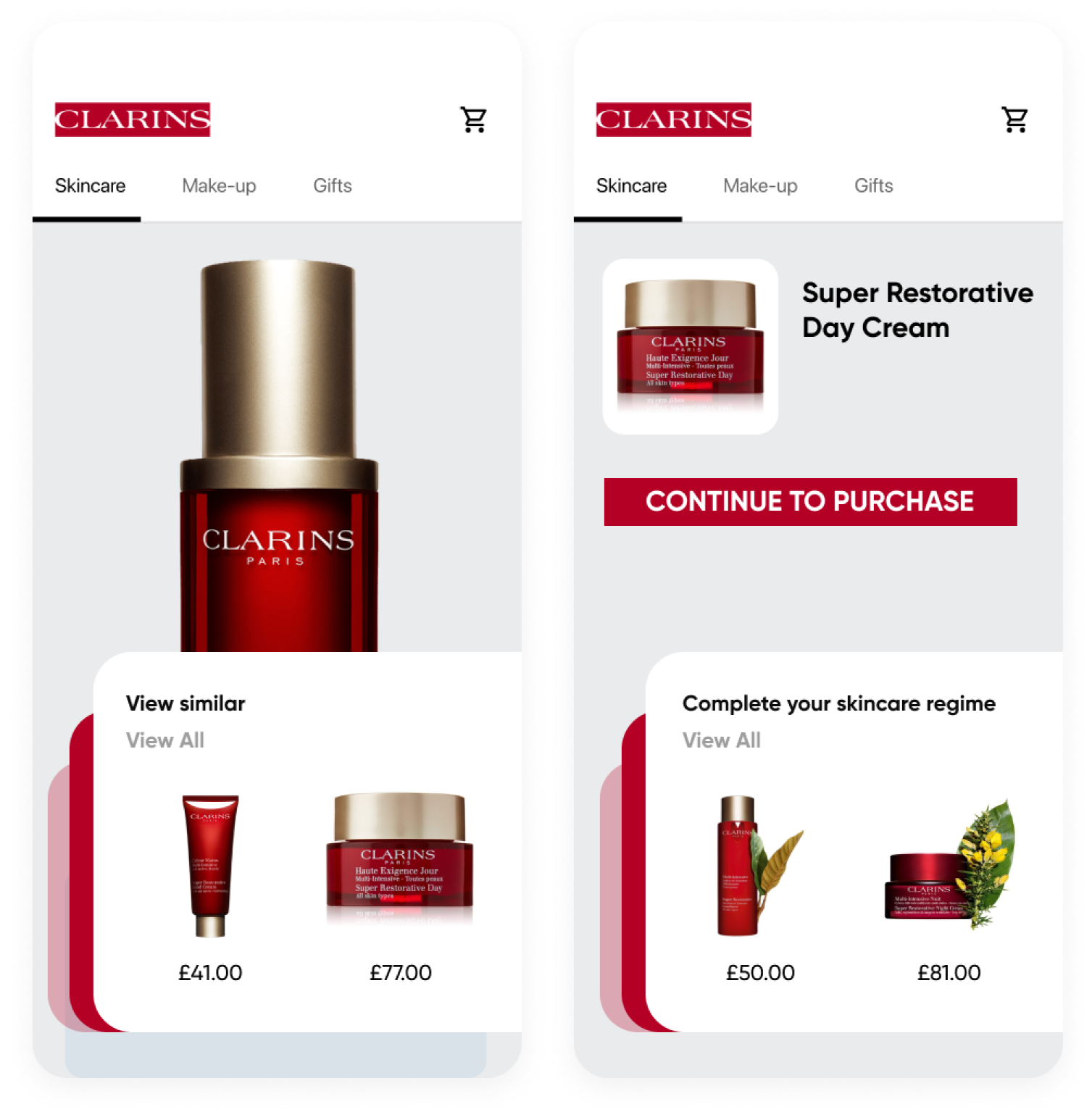 Clarins increased their ecommerce vital scores by personalizing product recommendations based on trending products, recently viewed items, location-based bestsellers, purchased together, and custom criteria.