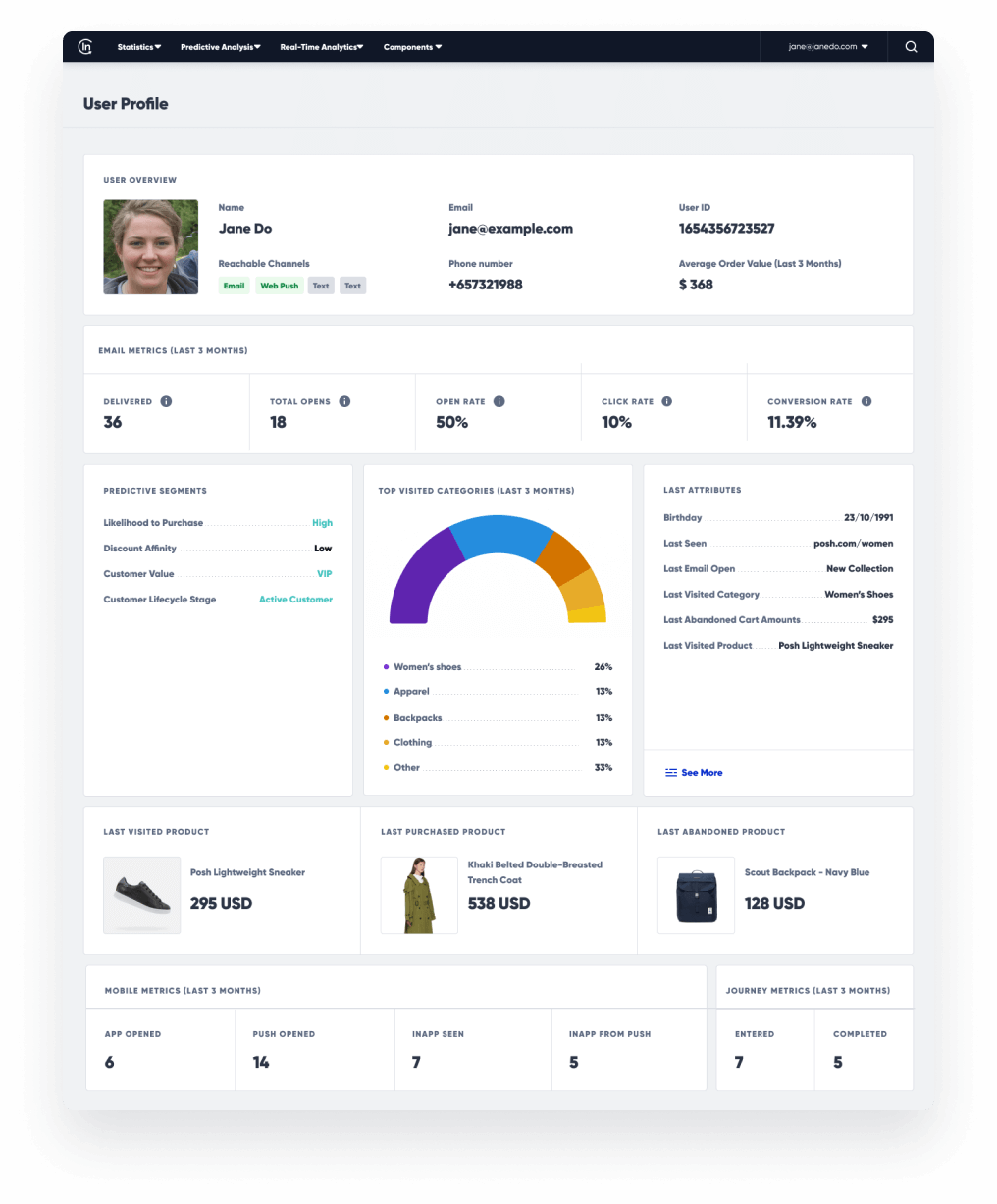 See more than a customer's past behavior with Insider's unified profiles. Dig deeper into each customer's predicted intent, affinity, and preferences. Anticipate what they'll do next and enhance their experience at every touchpoint leading up to conversion.