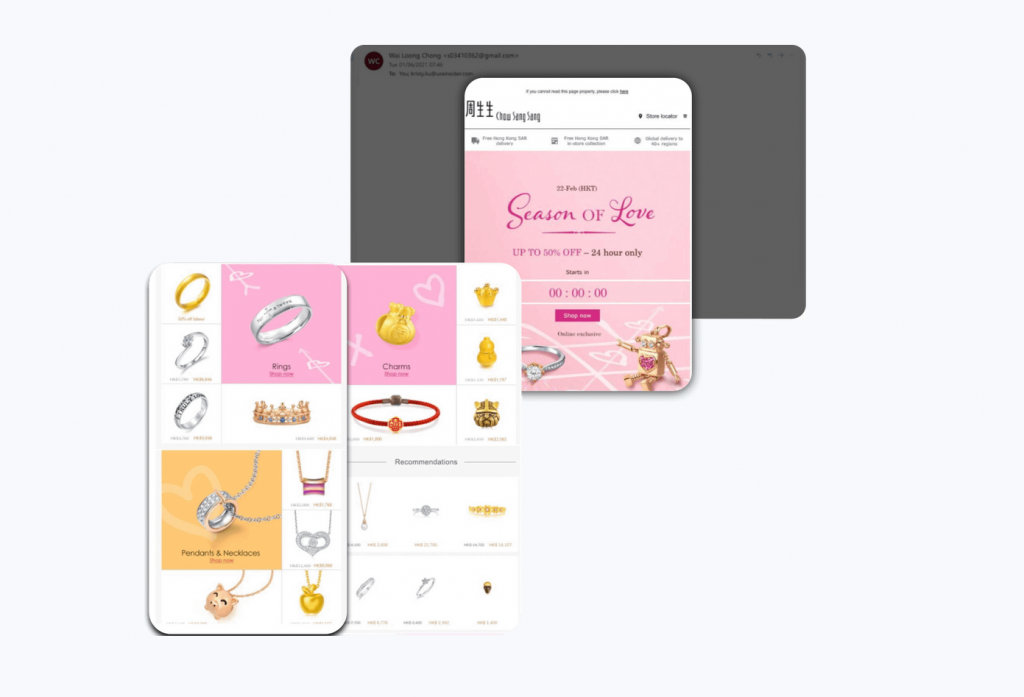 Jewelry brand Chow Sang Sang is a great example of the power of this strategy. Before working with Insider One, the company was using a basic and inflexible email solution that didn’t allow for personalization based on real-time data.Thanks to our platform, the brand’s marketing team started leveraging crowd-sourced recommendations to create flexible email recommendations. Specifically, they can now source recommendations based on the interest displayed by their customers and select all these products to be promoted in the email with just one click.