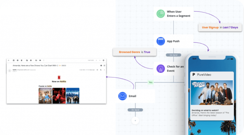 One of the persistent challenges to streaming marketers like you is to increase the viewership time. By pitching new video content that matches a user’s viewing history, you can encourage users to spend more time in the app. These related content messages pique curiosity. You can consider this as a unique form of media content cross-selling.