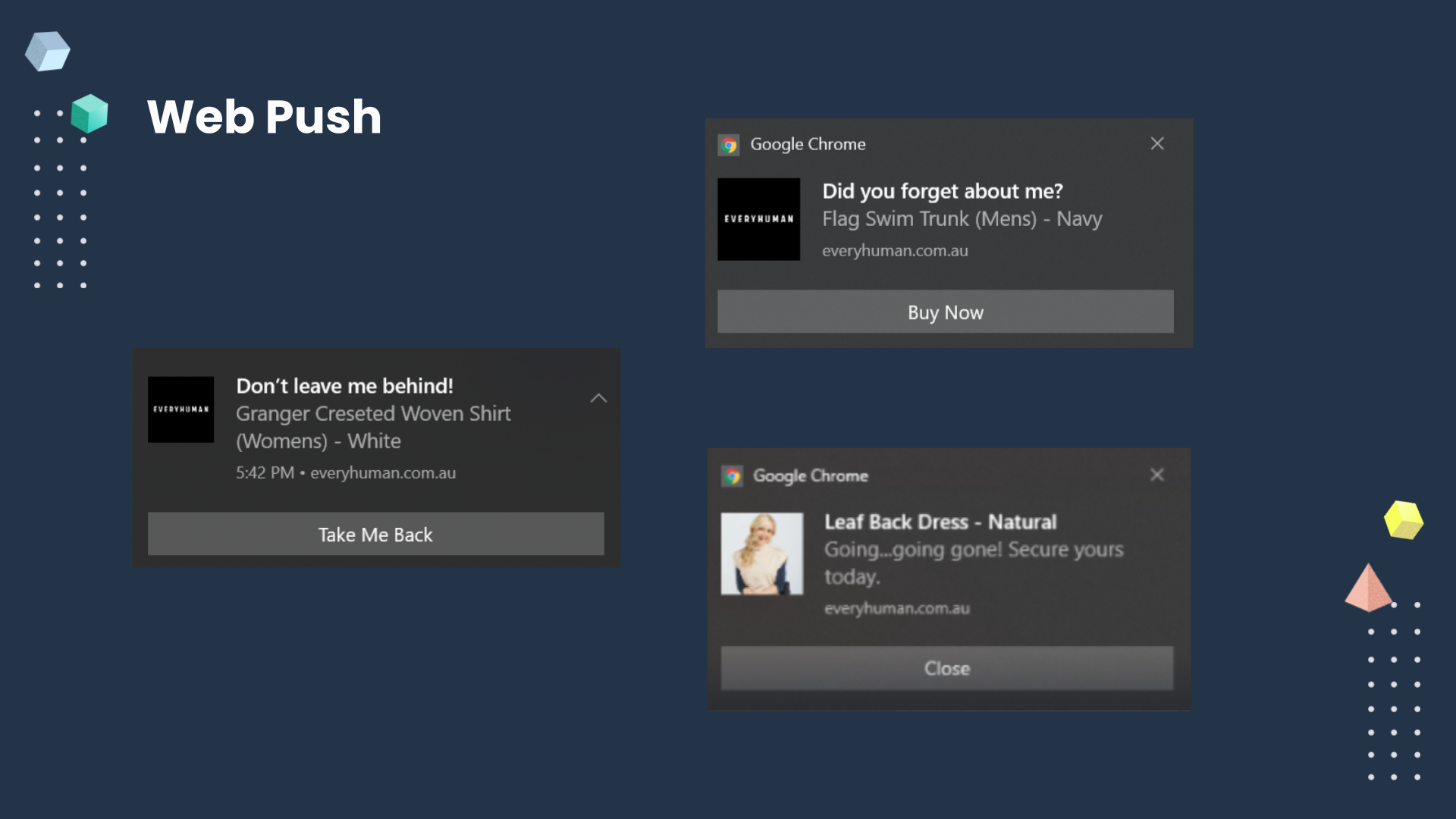 A browser-based notification system, Web Push allows you to access an otherwise-unknown audience and further helps your business communicate personalized conversations without requiring specific emails or phone numbers. For EveryHuman, Web Push has done a fantastic job of gaining back customers who had abandoned carts using timely push notifications. Other Web Push uses have been to push in-stock and price-drop alerts.