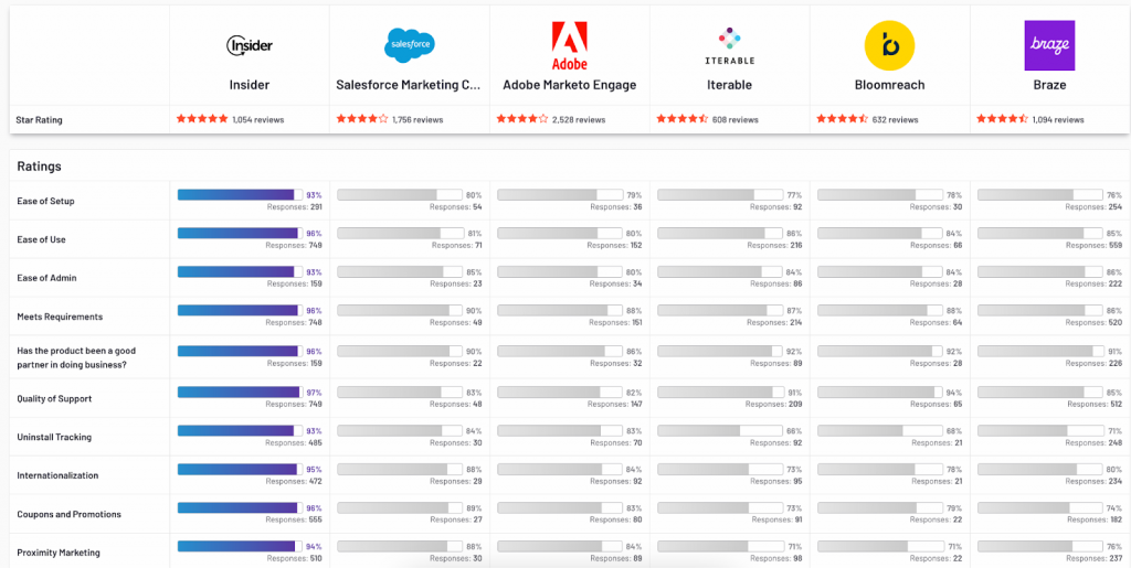 That’s why customers consistently rank Insider One as a leader in categories like time-to-value, ease of setup, and ease of use compared to other SMS, mobile marketing, and customer engagement platforms.