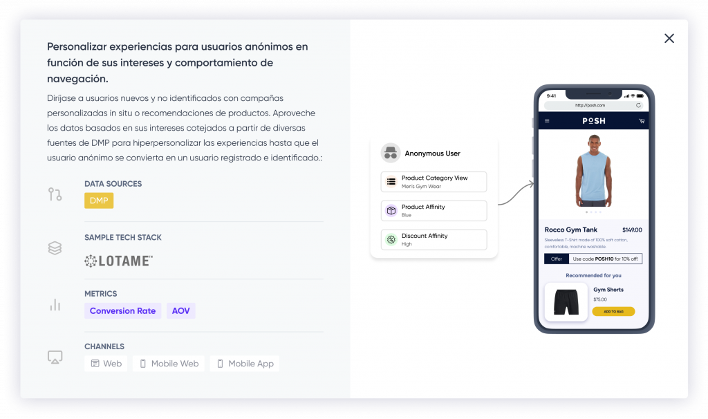 Con tus datos listos, puedes comenzar a personalizar la experiencia de los visitantes anónimos. Esto incluye todos los elementos de tu sitio, como banners, categorías, recomendaciones de productos y más.