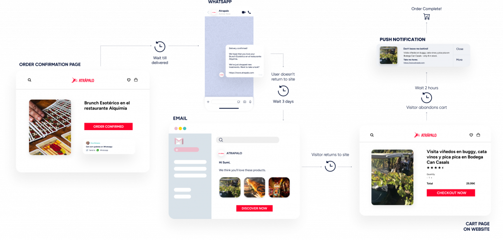 Utiliza notificaciones Web Push, WhatsApp, Facebook Messenger, correo electrónico, SMS y RCS. Envía alertas automáticas y mensajes personalizados con recordatorios de carrito abandonado para acelerar las decisiones de compra y recuperar las ventas perdidas.