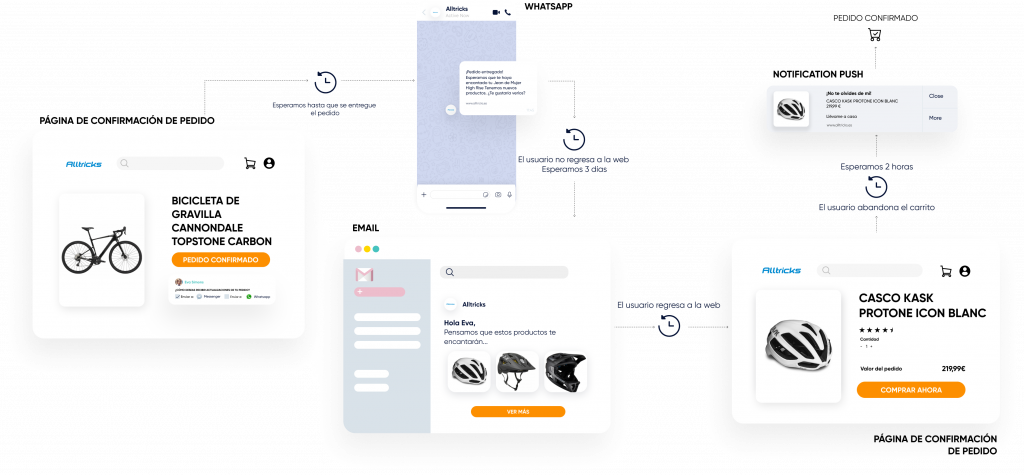 Utiliza notificaciones Web Push, WhatsApp, Facebook Messenger, correo electrónico, SMS y RCS. Envía alertas automáticas y mensajes personalizados con recordatorios de carrito abandonado hasta recordatorios de «back-in-stock» para acelerar las decisiones de compra y recuperar las ventas perdidas.