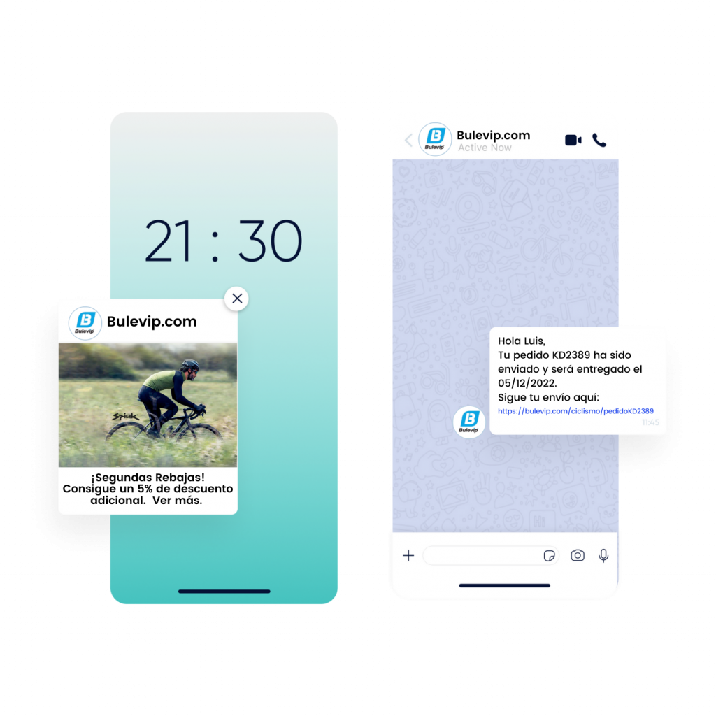 Utiliza notificaciones Web Push, WhatsApp, Facebook Messenger, correo electrónico, SMS y RCS. Envía alertas automáticas y mensajes personalizados con recordatorios de carrito abandonado hasta recordatorios de «back-in-stock» para acelerar las decisiones de compra y recuperar las ventas perdidas.