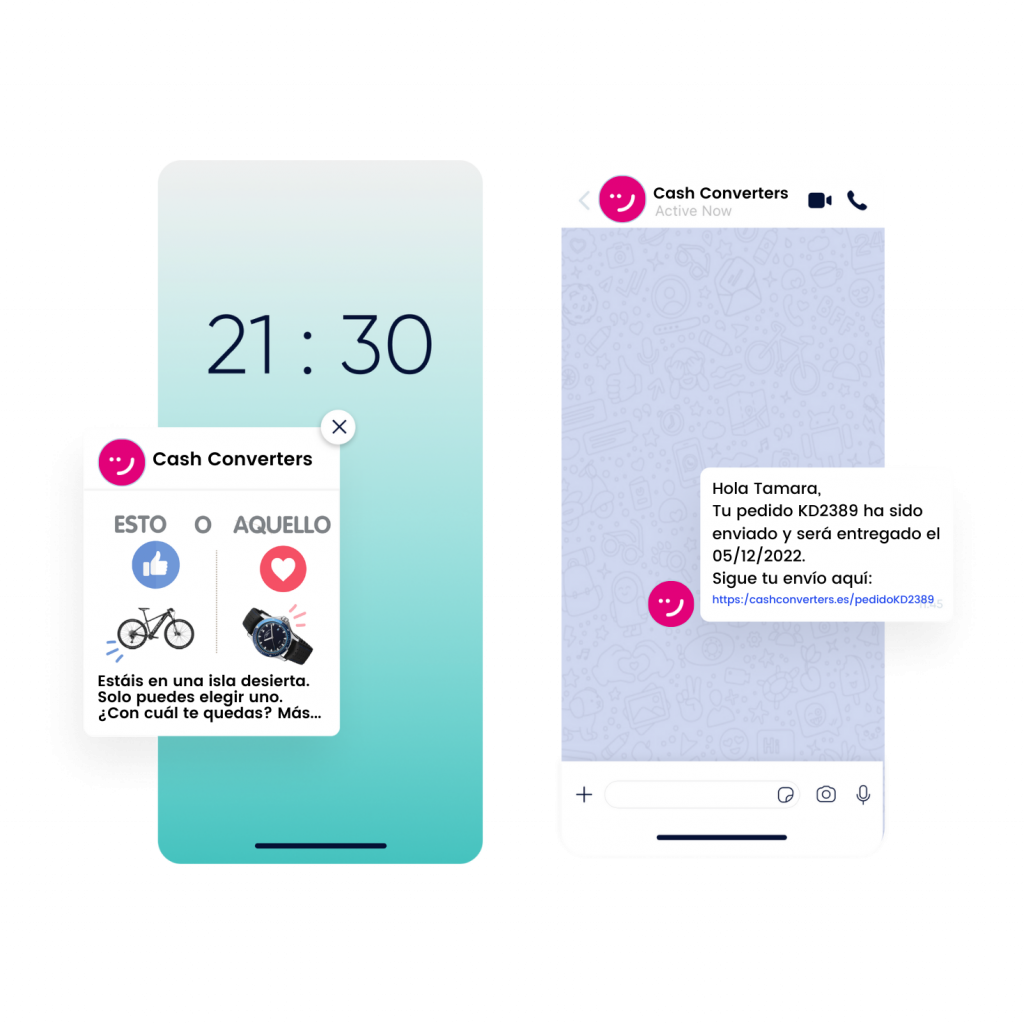 Utiliza notificaciones Web Push, WhatsApp, Facebook Messenger, correo electrónico, SMS y RCS. Envía alertas automáticas y mensajes personalizados con recordatorios de carrito abandonado hasta recordatorios de «back-in-stock» para acelerar las decisiones de compra y recuperar las ventas perdidas.