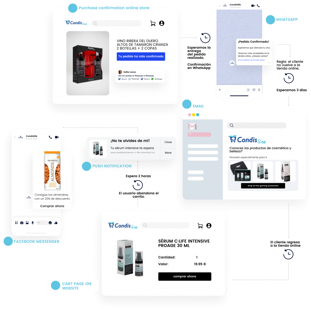 Utiliza notificaciones Web Push, WhatsApp, Facebook Messenger, correo electrónico, SMS y RCS. Envía alertas automáticas y mensajes personalizados con recordatorios de carrito abandonado hasta recordatorios de «back-in-stock» para acelerar las decisiones de compra y recuperar las ventas perdidas.