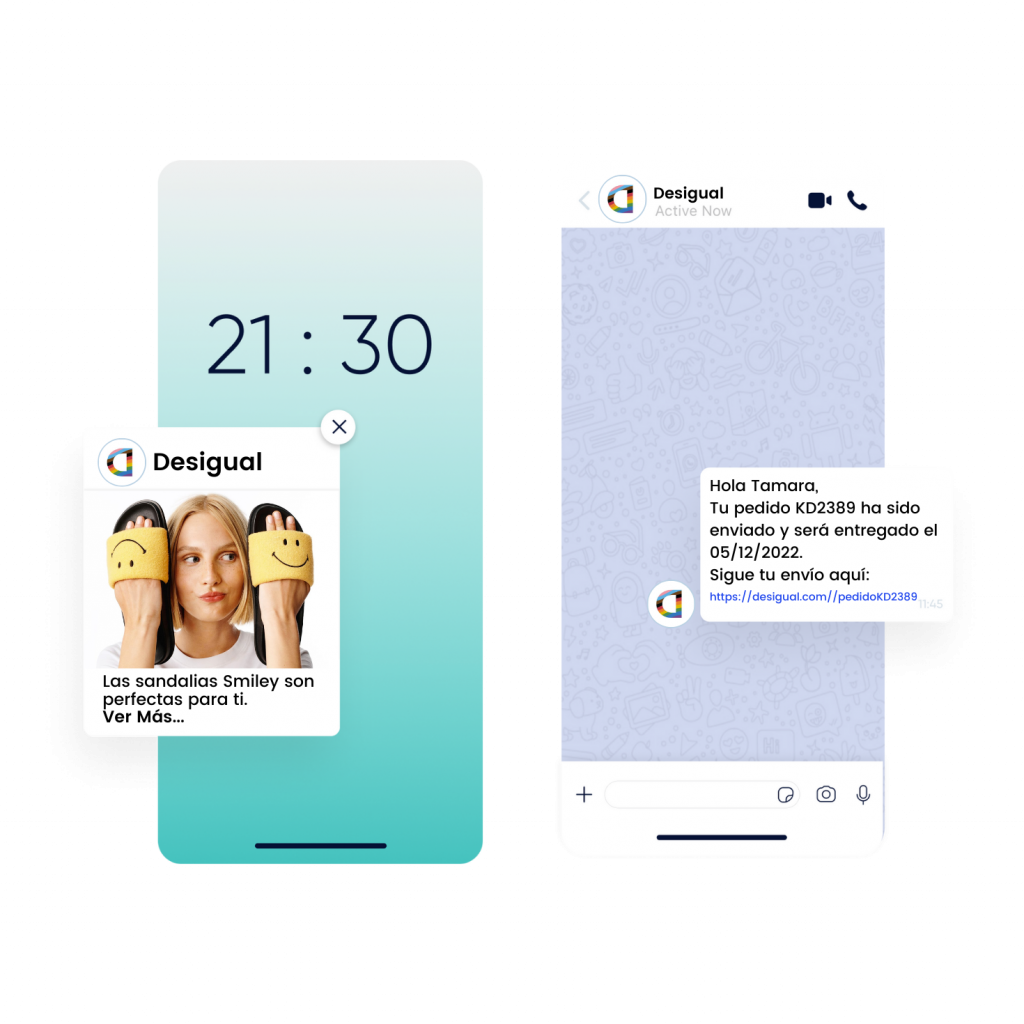 Utiliza notificaciones Web Push, WhatsApp, Facebook Messenger, correo electrónico, SMS y RCS. Envía alertas automáticas y mensajes personalizados con recordatorios de carrito abandonado hasta recordatorios de «back-in-stock» para acelerar las decisiones de compra y recuperar las ventas perdidas.