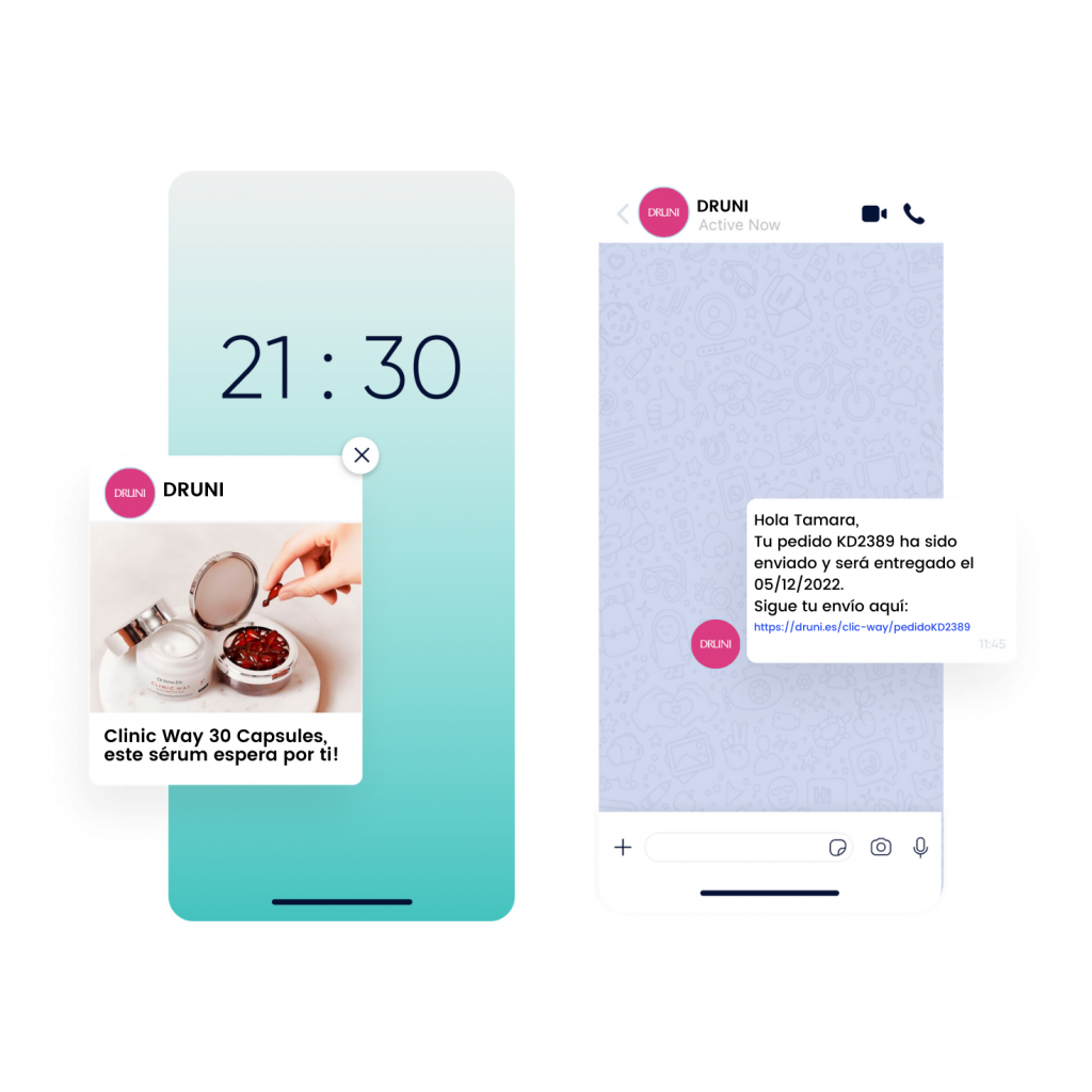 Utiliza notificaciones Web Push, WhatsApp, Facebook Messenger, correo electrónico, SMS y RCS. Envía alertas automáticas y mensajes personalizados con recordatorios de carrito abandonado hasta recordatorios de «back-in-stock» para acelerar las decisiones de compra y recuperar las ventas perdidas.