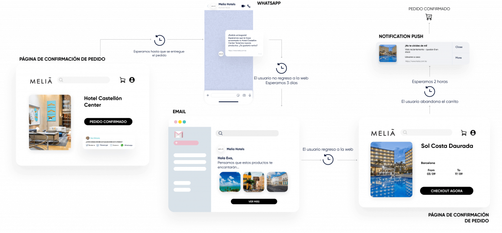 Use notificaciones Web Push, WhatsApp,correo electrónico, SMS y RCS.
