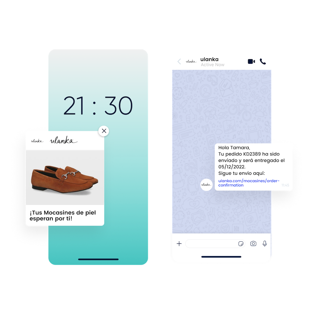 Utiliza notificaciones Web Push, WhatsApp, Facebook Messenger, correo electrónico, SMS y RCS. Envía alertas automáticas y mensajes personalizados con recordatorios de carrito abandonado hasta recordatorios de «back-in-stock» para acelerar las decisiones de compra y recuperar las ventas perdidas.