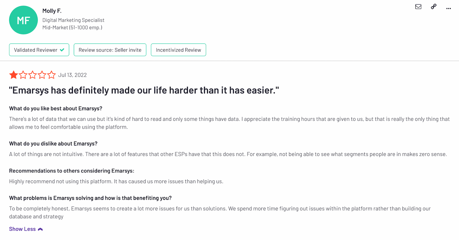 Una desventaja significativa de Emarsys es su dependencia de equipos técnicos para ejecutar tareas complejas como lanzar campañas, hacer iteraciones o realizar pruebas.