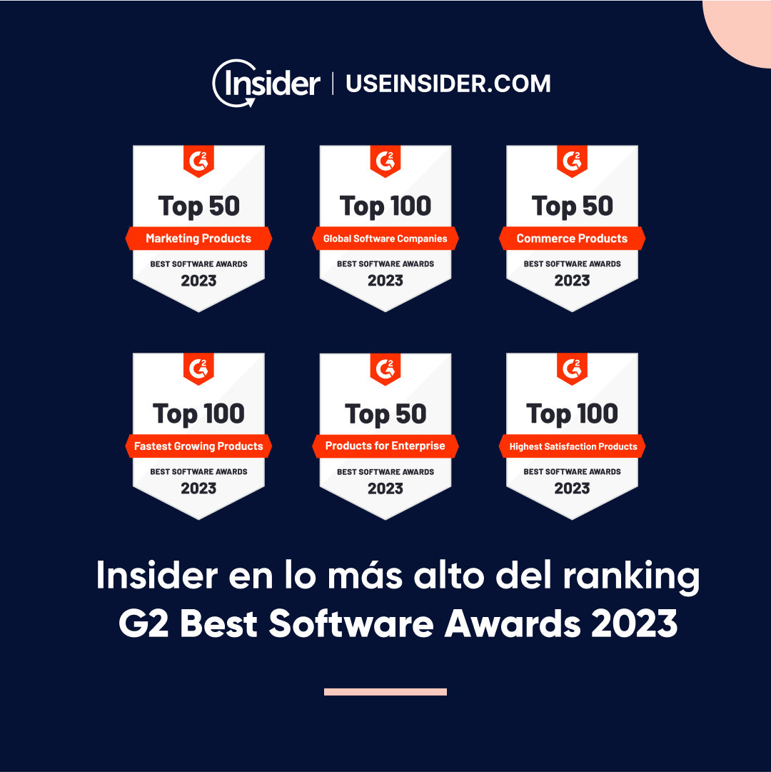 Cada año, G2 anuncia sus Premios al Mejor Software para reconocer a las empresas y productos de software basados en reseñas genuinas de los usuarios. Con más de 80 millones de compradores de software que visitan G2 anualmente para evaluar productos, los premios y las clasificaciones indican cómo se perciben las diferentes soluciones de software en el mercado. Es un gran placer anunciar que Insider One ocupó el puesto número 17 en los 100 mejores productos de software para 2023.