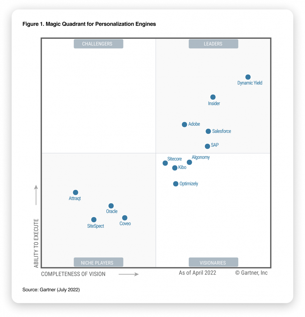 Por segundo año consecutivo, Insider lideró el Gartner® Magic Quadrant™ 2022 en la categoría de Personalización entre 13 proveedores de soluciones, evaluados por su capacidad de ejecución y visión completa. Insider obtuvo la mejor puntuación en Marketing (4.1/5.0) y Servicios y soporte (4.16/5.0) Casos de uso