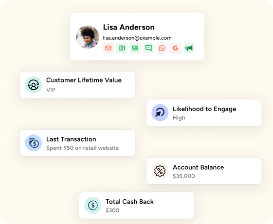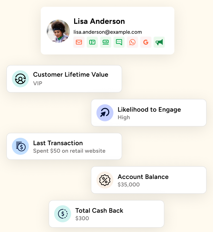 Integrate data from your core banking system, payment gateway, loan management, ERP, and more to build 360-degree customer profiles and improve segment precision.