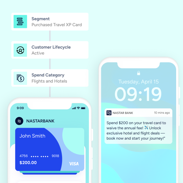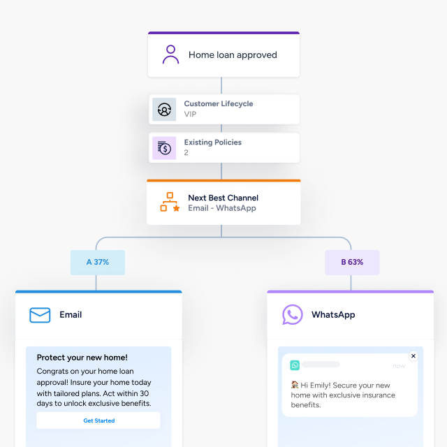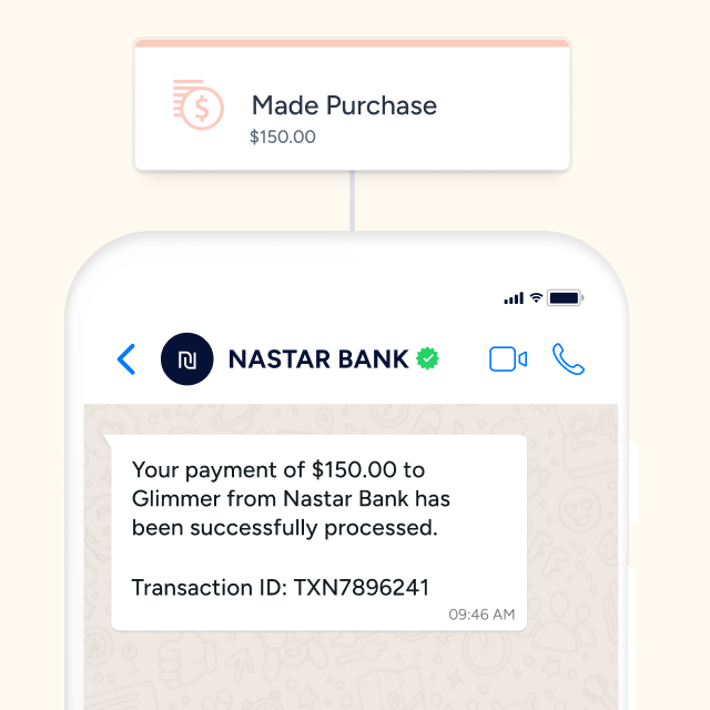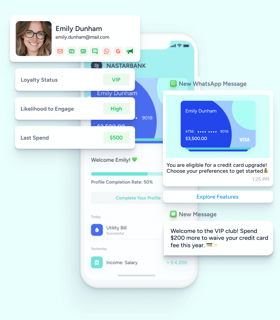 Deliver seamless banking experiences that drive customer actions across their preferred channels—WhatsApp, SMS, Email— powered by real-time transactions and behavioral insights.