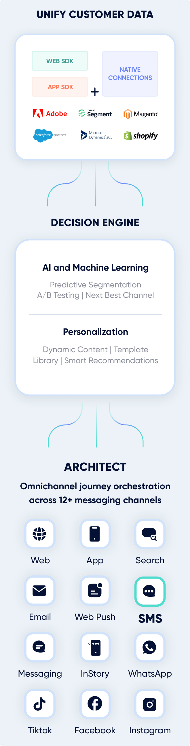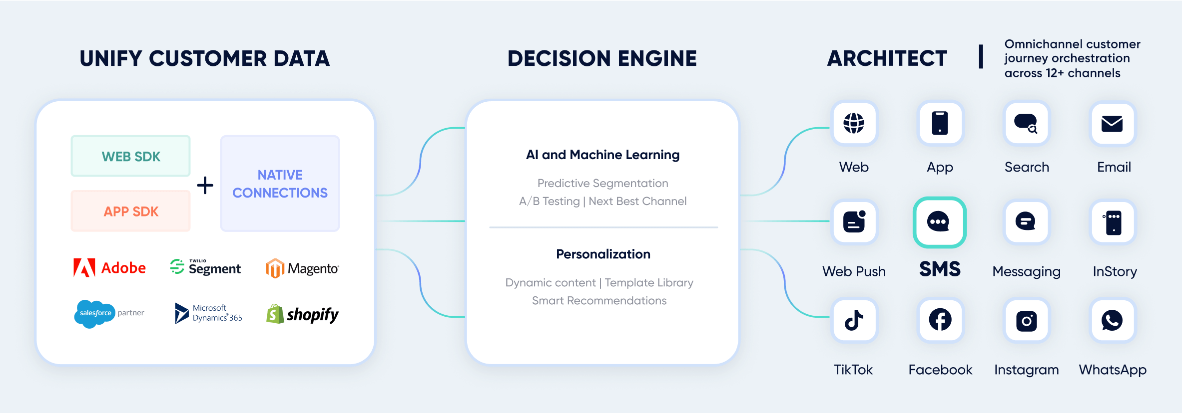Notre vaste gamme de canaux est l’une des principales raisons pour lesquelles nous avons été élus meilleur logiciel de marketing automation du marché. Insider prend en charge plus de 12 canaux, ainsi que des SDK, des API REST, des webhooks et des intégrations prédéfinies pour vous aider à vous connecter, à échanger et à activer vos données clients dans les plus brefs délais.