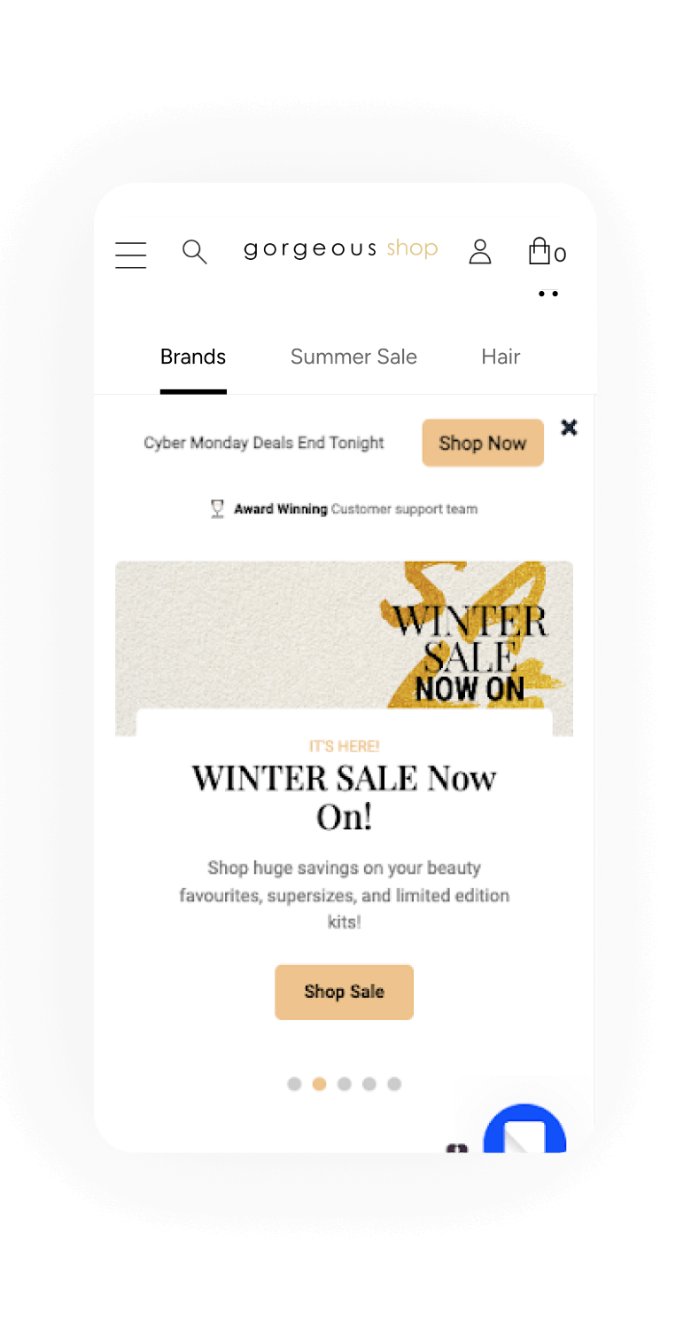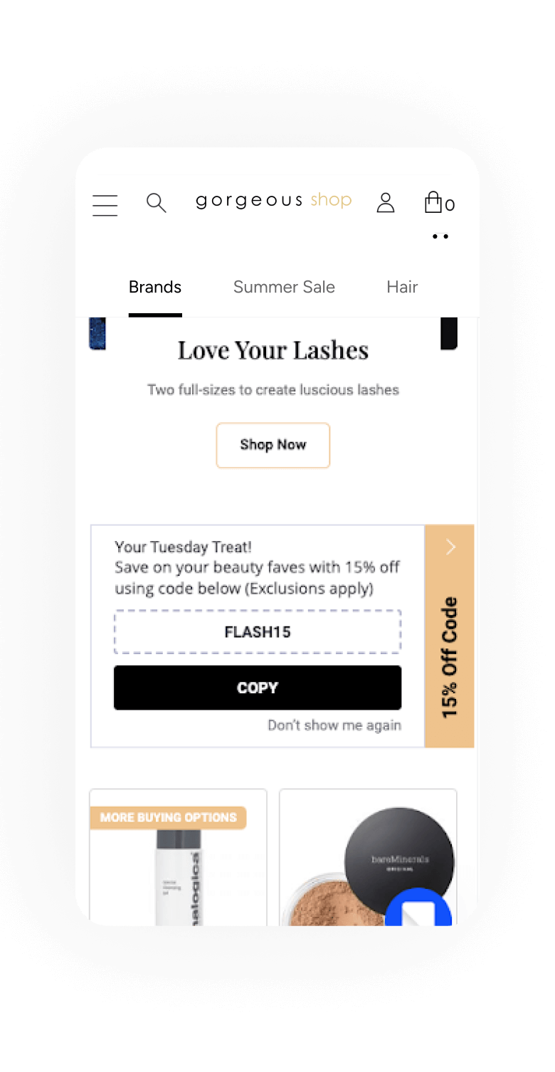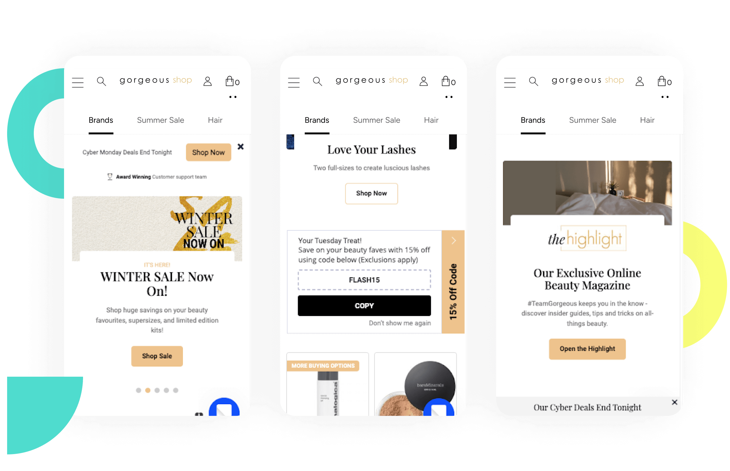Pour optimiser les promotions pendant les peak seasons, Gorgeous Shop a utilisé des modèles Web Suite d’Insider, incluant des coupons latéraux et des barres d’annonces. Les coupons latéraux suggèrent des réductions sans perturber la navigation, tandis que les barres d’accueil annoncent les promotions clés. Ces modèles permettent une adaptation rapide aux campagnes, stimulant ainsi les ventes et l’engagement client pendant les périodes critiques comme le Black Friday.