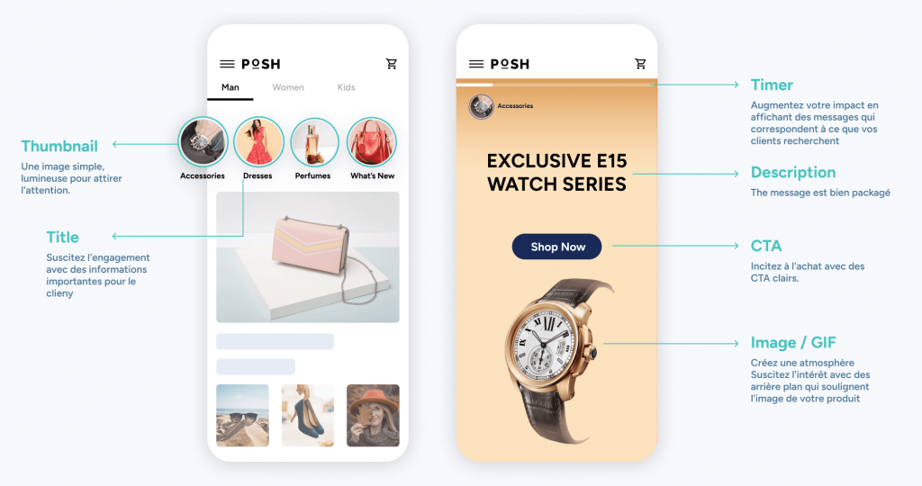 Par exemple, en utilisant les capacités de personnalisation sur site d’Insider One, vous pouvez personnaliser les bannières, les catégories, les recommandations de produits et les résultats de la recherche sur le site que voient les clients. Vous pouvez également utiliser InStory pour ajouter de stories, semblables à celles d’Instagram, à votre site ou votre application, ce qui est excellent pour stimuler l’engagement, la découverte produits et les revenus.