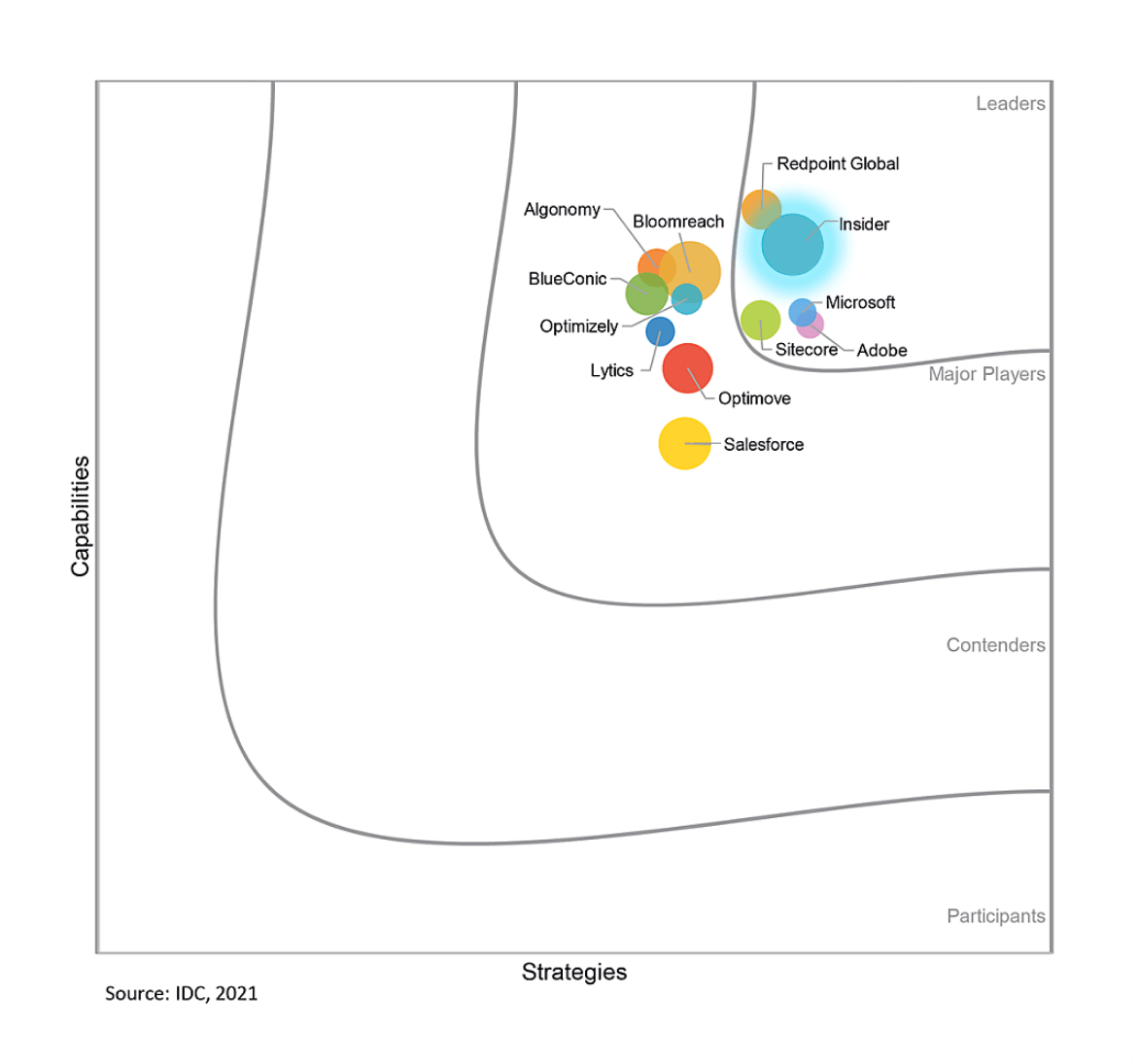« Insider est une plateforme robuste et intuitive qui aide les spécialistes du marketing à obtenir une vue à 360 degrés du client et qui permet l’analyse, l’orchestration et la personnalisation du parcours client. (Source : IDC)